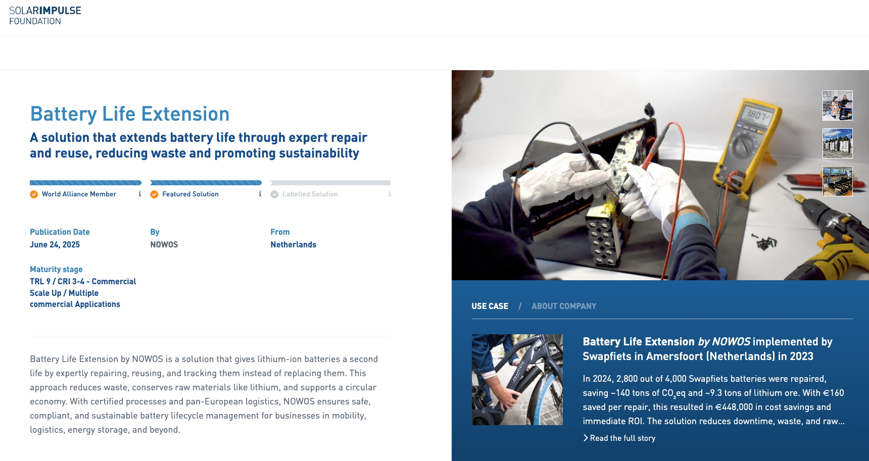 Swapfiets, a European leader in e-bike subscriptions, partnered with NOWOS to extend battery life through expert repair and reuse. Faced with rising maintenance costs and growing battery waste, Swapfiets adopted NOWOS's circular repair service. Faulty batteries are collected, diagnosed, and repaired using original parts, then returned to the fleet. This reduces waste, prevents downtime, and avoids unnecessary production of new batteries, supporting a sustainable and cost-effective business model in urban mobility.