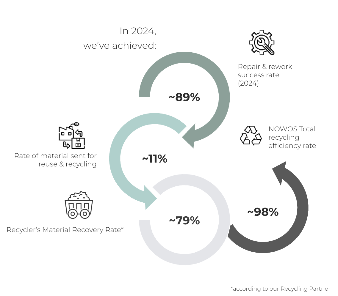 In 2024, we calculated a 98% material recycling efficiency rate, when we combine our repair rate and our recyclers’ efficiency rate.